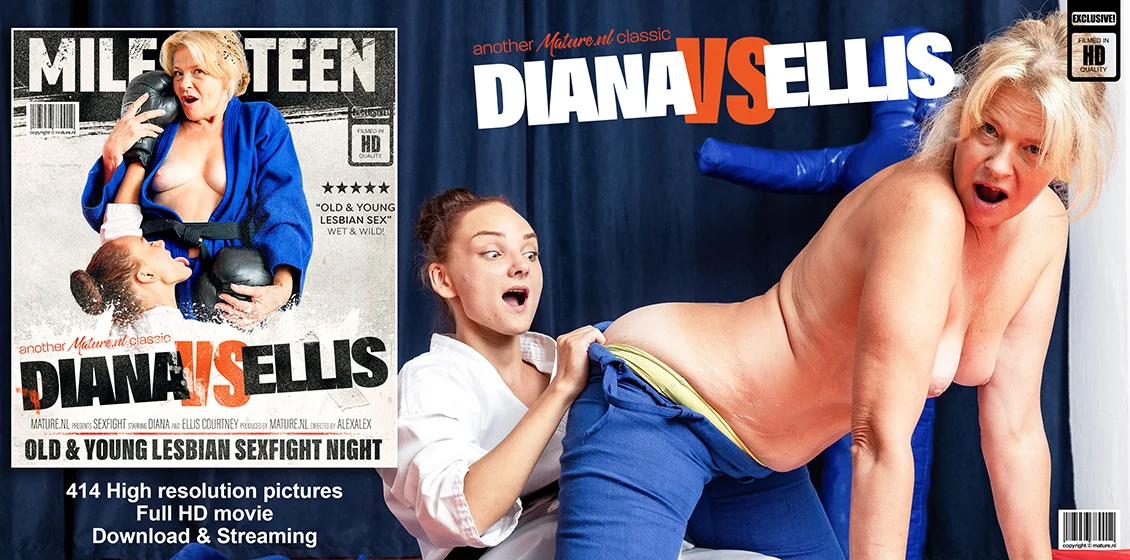 57 year old MILF Diana gets wet with 26 year old Ellis in this old & young lesbian sexfight match