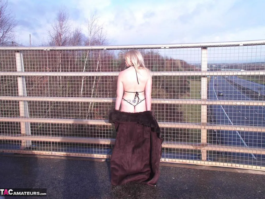 Barby out in her mini bikini on the bridge over M6 Toll Road
