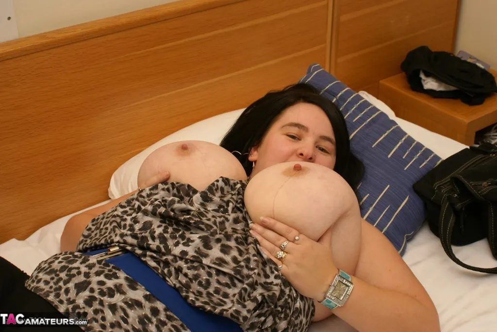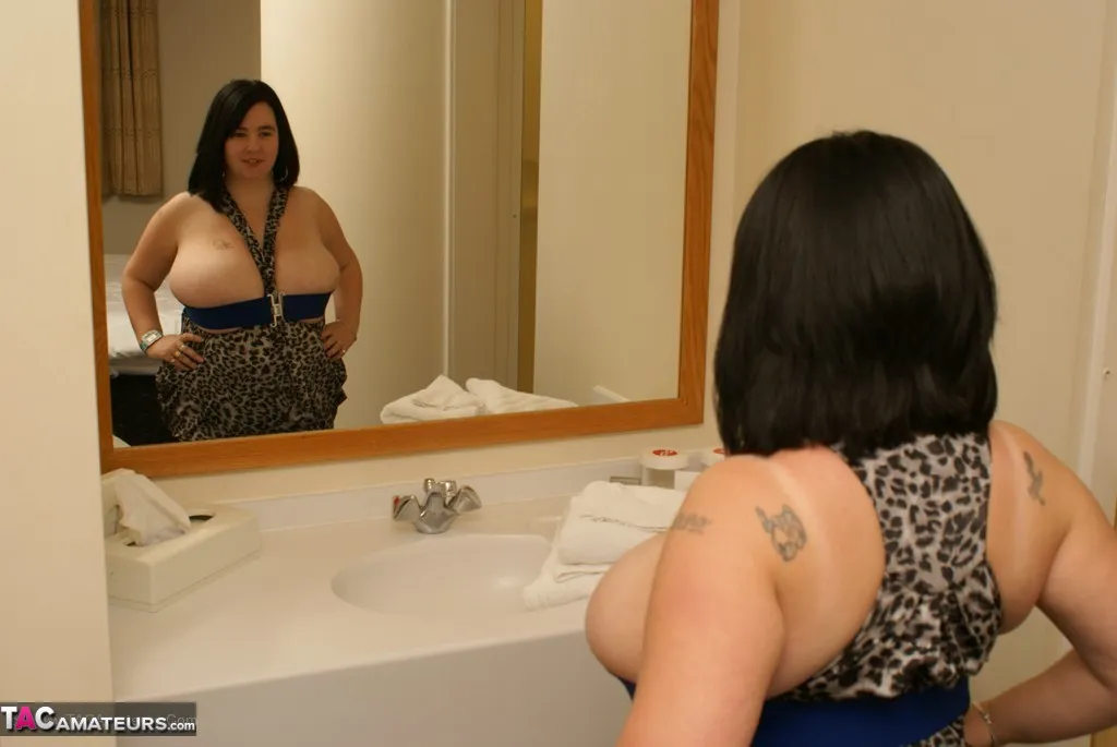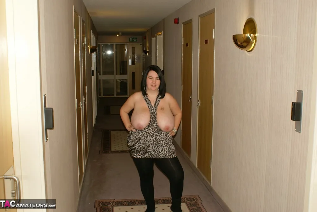 Wearing a tight blue belt around my huge boobs and doing a bit of flashing in hotel passage way x