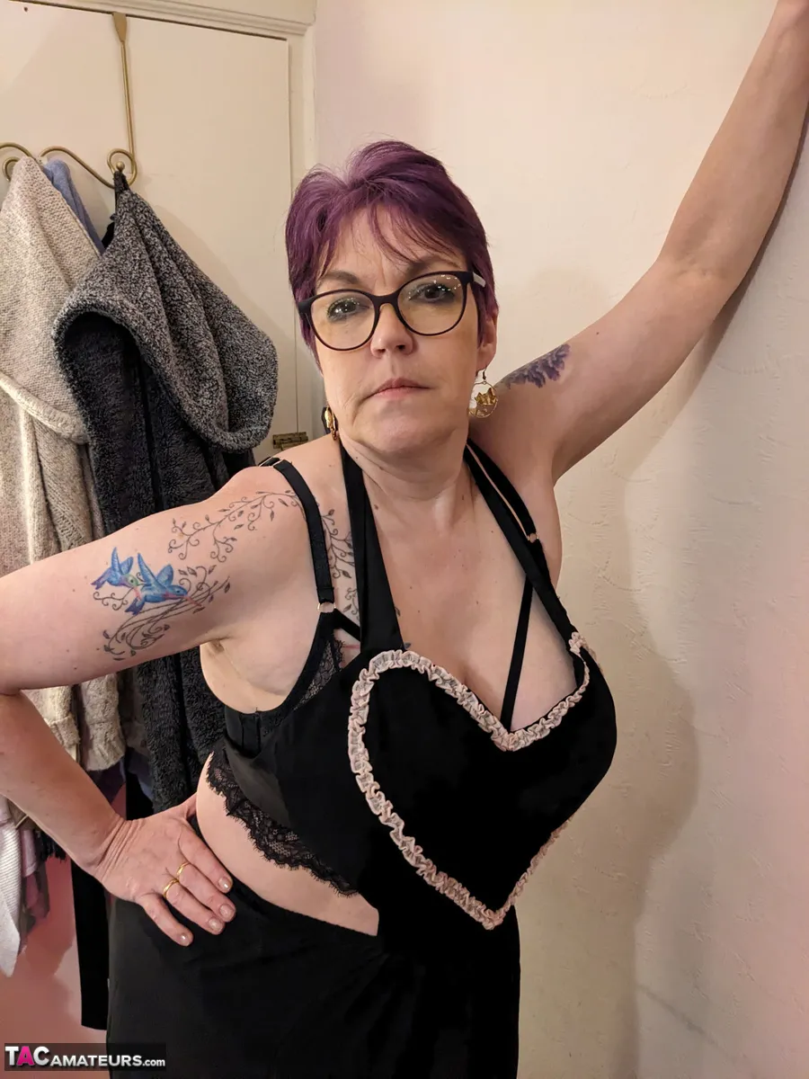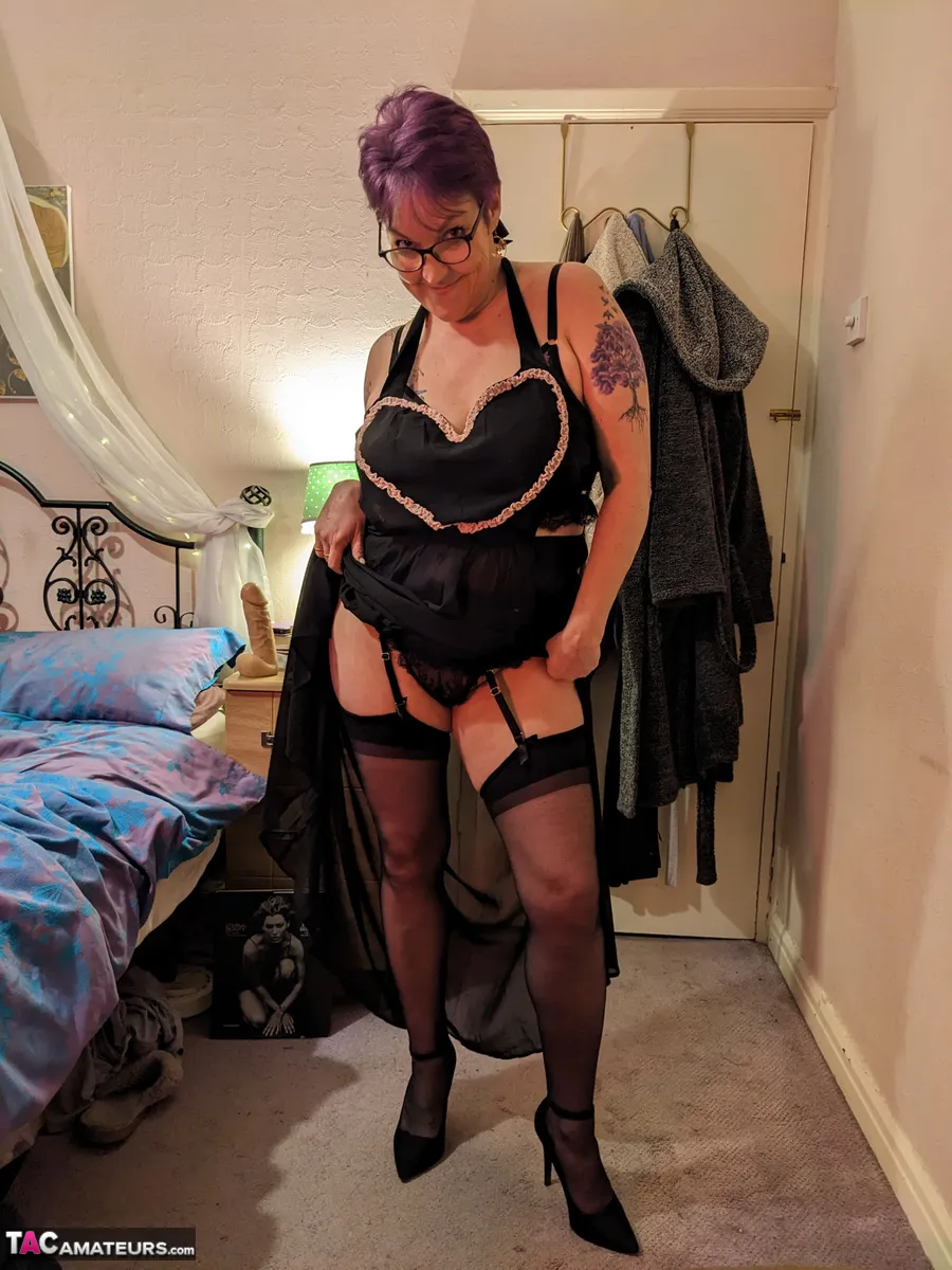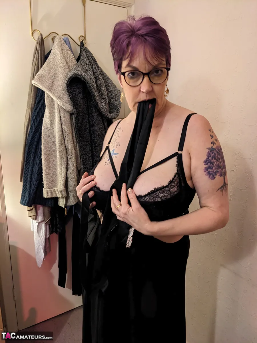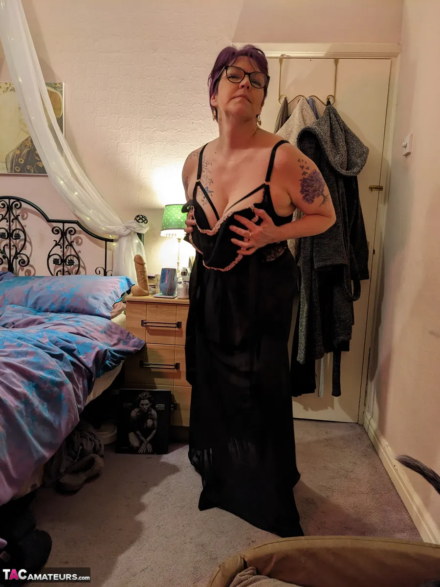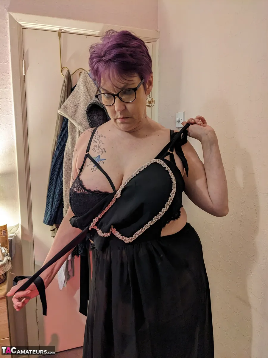Watch me strip for you, taking off my silky black gown, releasing my big tits for you to caress, leaving my sexy black s