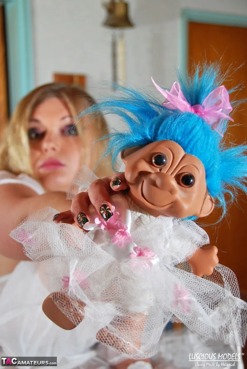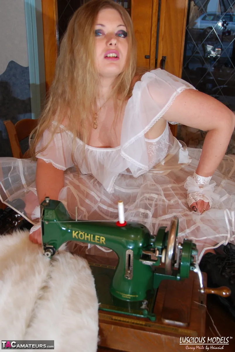 Curvy blonde Meile sexy teasing in white dress on her sewing table.