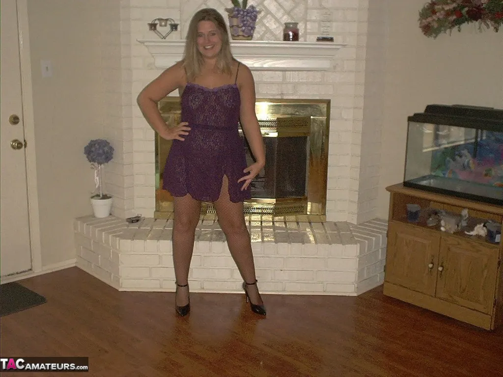I surprised hubby with a fishnet body stocking and new purple nighty. Whenever he sees me like this, he gets an instant