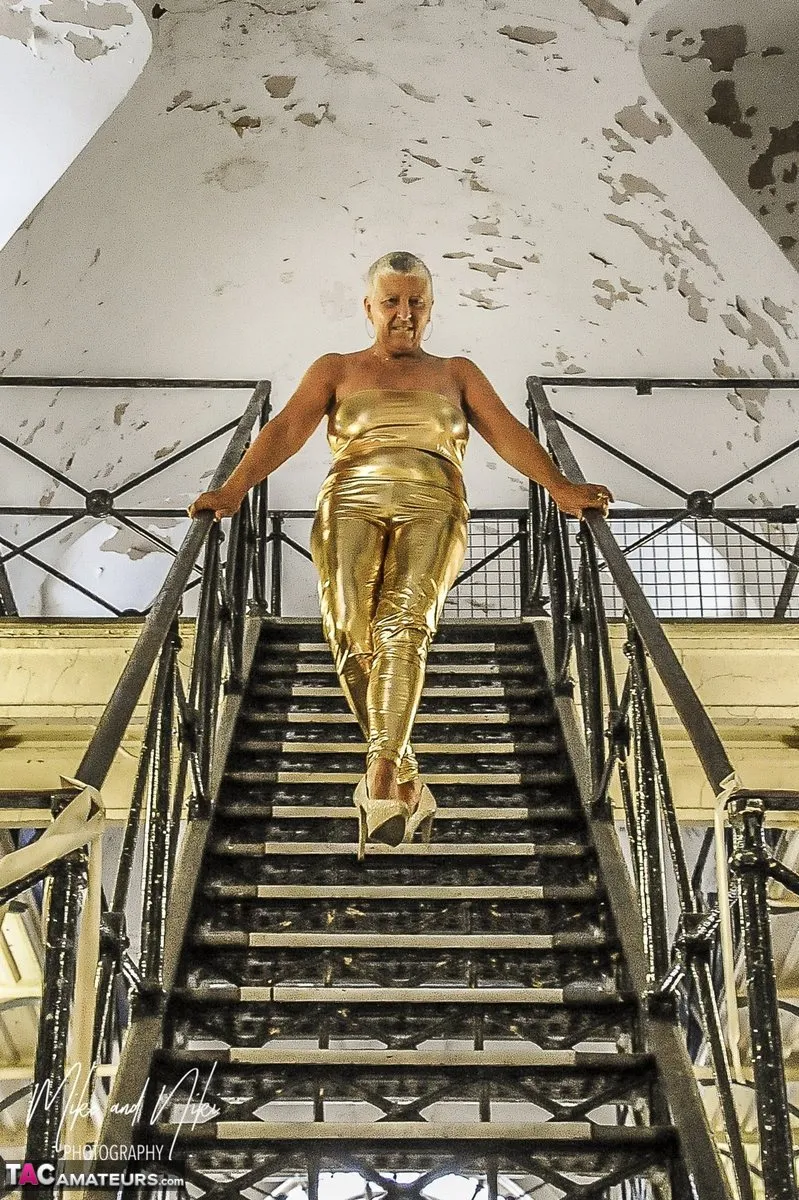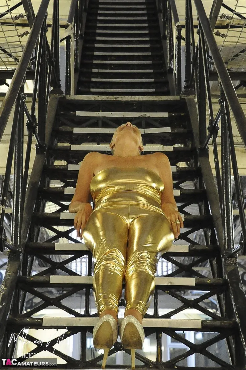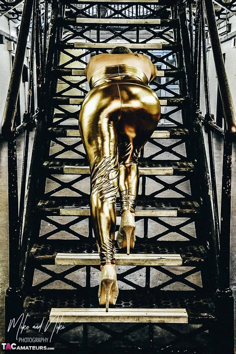 Hello guysLooking lovely in my golden leggings and black evening dress xx