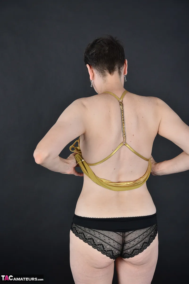 Posing and strip in a golden dress.And underneath a hot panties.I drop both.Im Goldenen KleidPosing und Strip im goldene