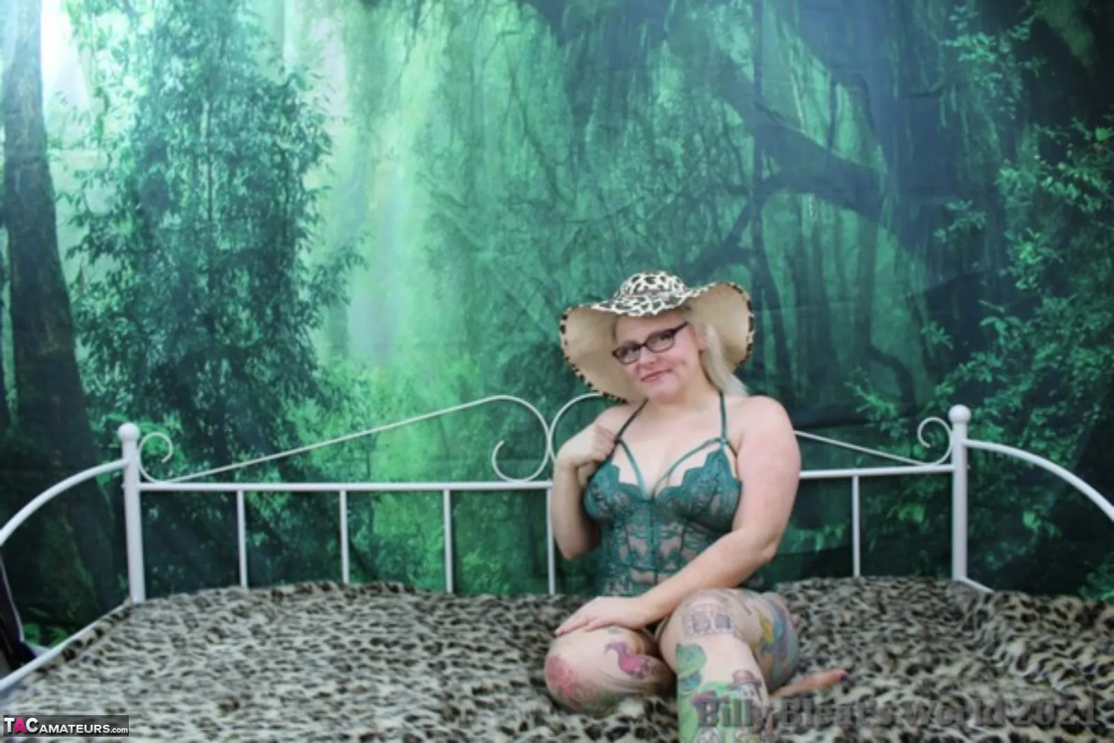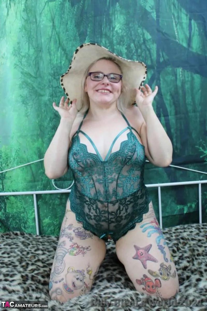 Mollie is in a crutchless green body suit and has a large penis shaped dilldo. Which she fucks herself with.