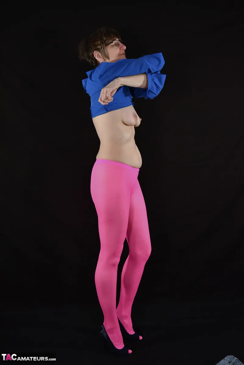 Me in a tight blue blouse and pink Pantyhose.Nice contrast when taking Pictures.Neon Pink StrumpfhoseIch in einer knappe