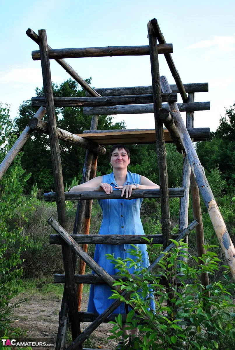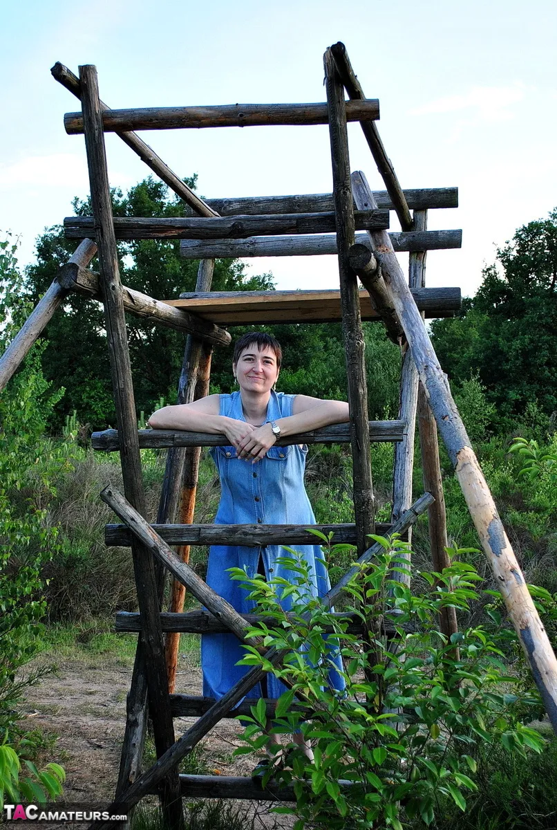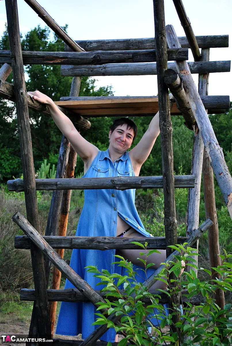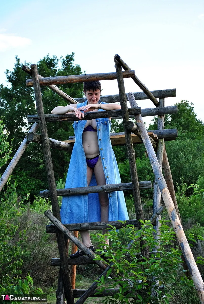 Discovered a perch during a walk.Climbed straight up in a jeans dress.I unbuttoned it and showed you my lingerie underne