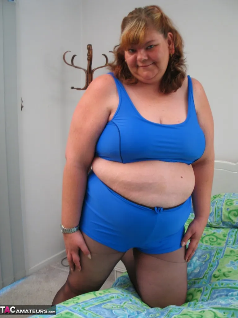 Just posing in my new blue lycra boyleg pants and matching top, with black stockings.