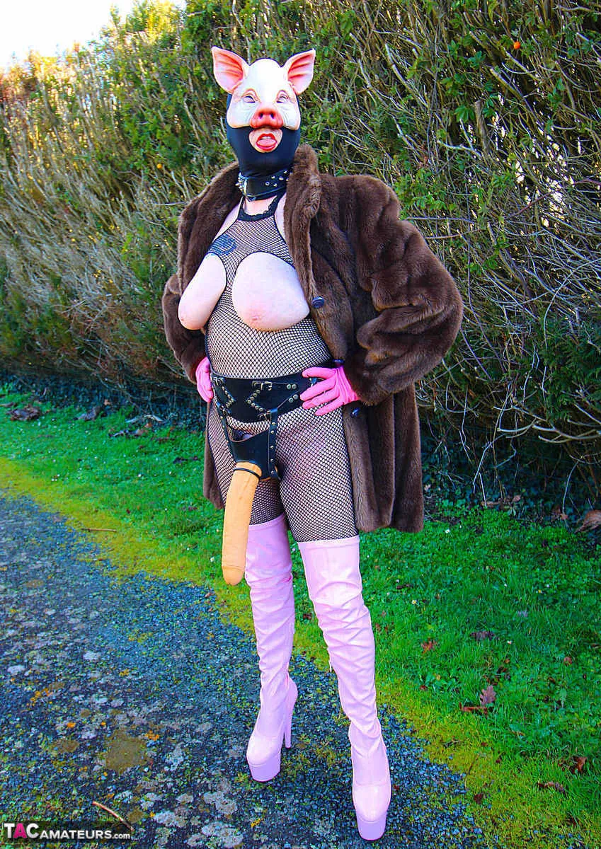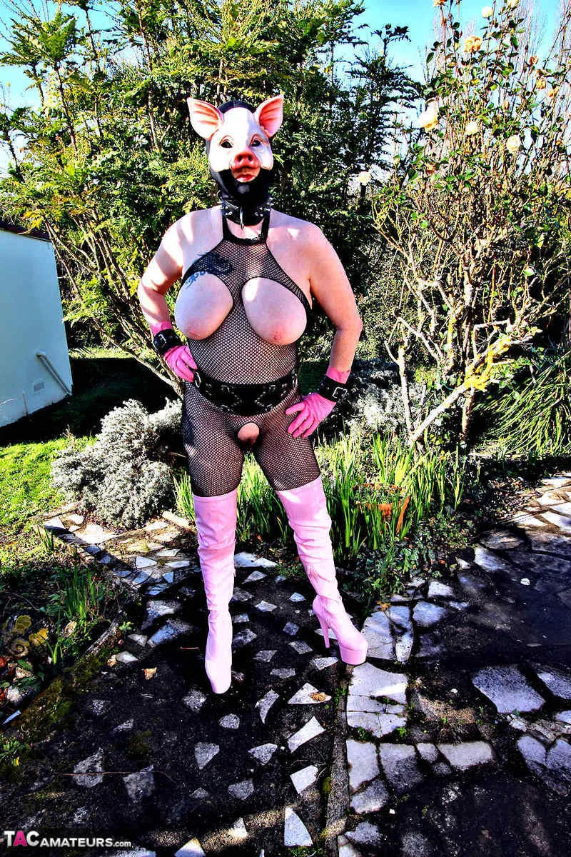 Photo set where I am dressed in a fishnet jumpsuit with pink rubber gloves and a pair of pink thigh boots. I pose in var