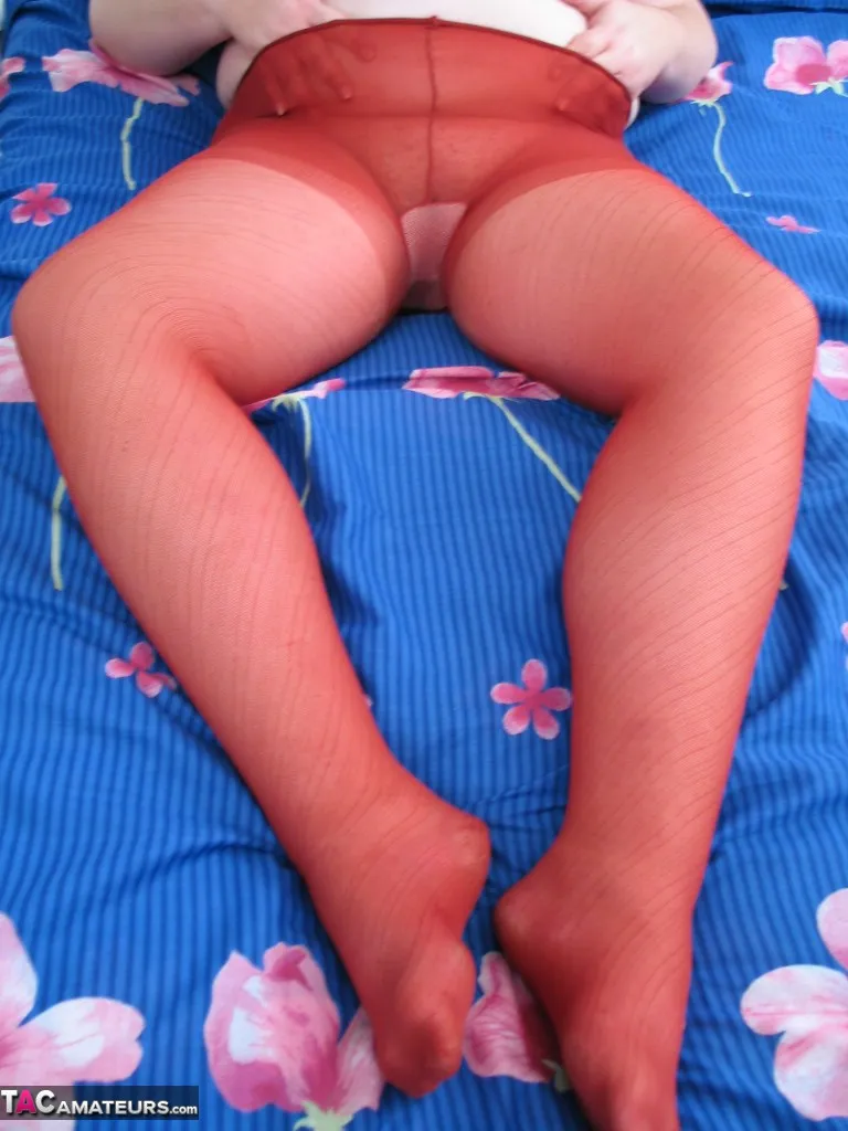 Watch me playing with my pink vibe in my red knickers and bra with red pantyhose. I got so excited I used the pantyhose