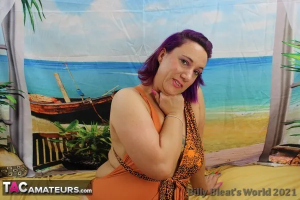 Sara Banks is in her orange swim suit which she strips out of and uses a glass dildo.