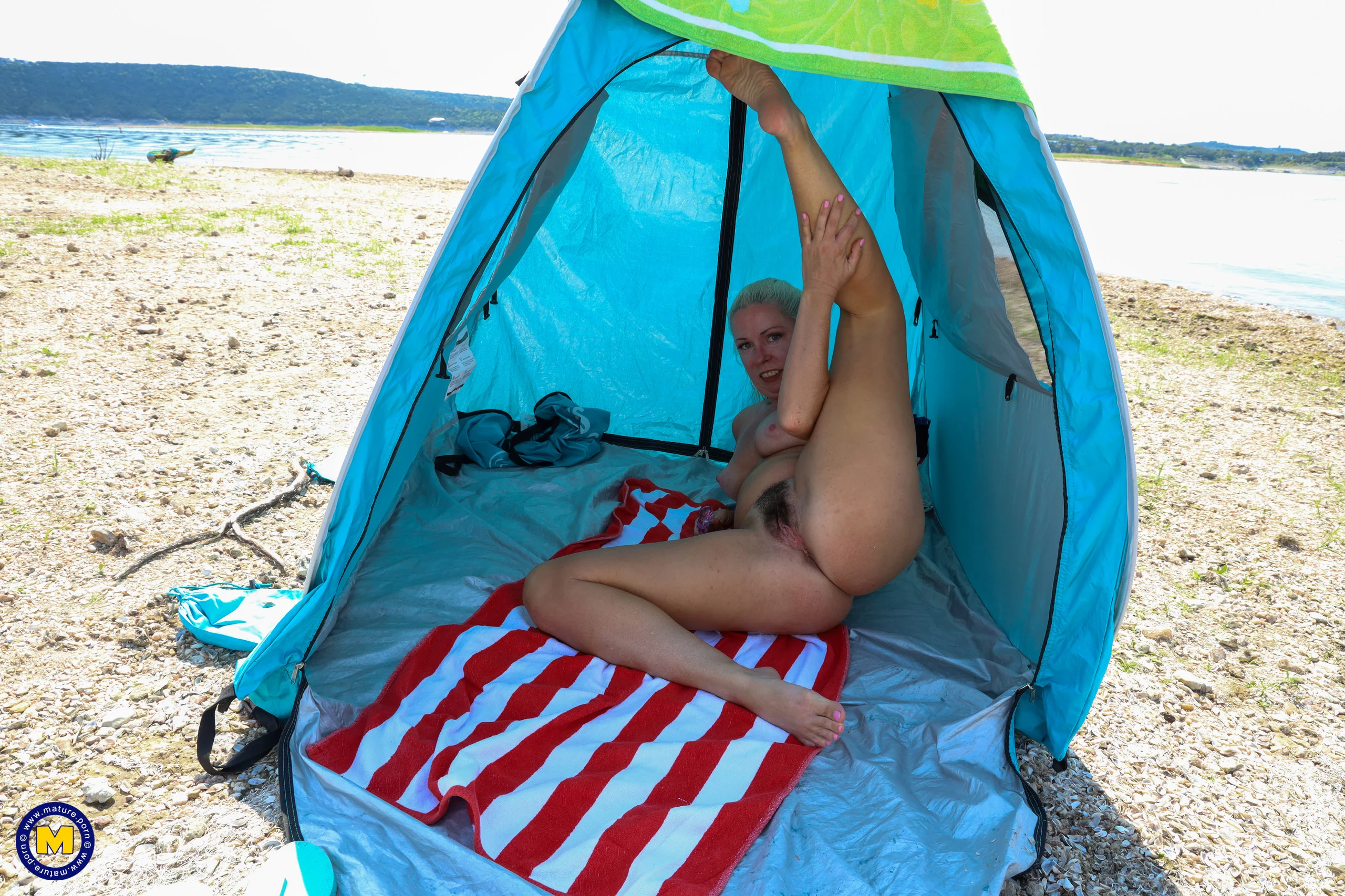 See voyeur MILF Beth show off her hairy pussy at the beach