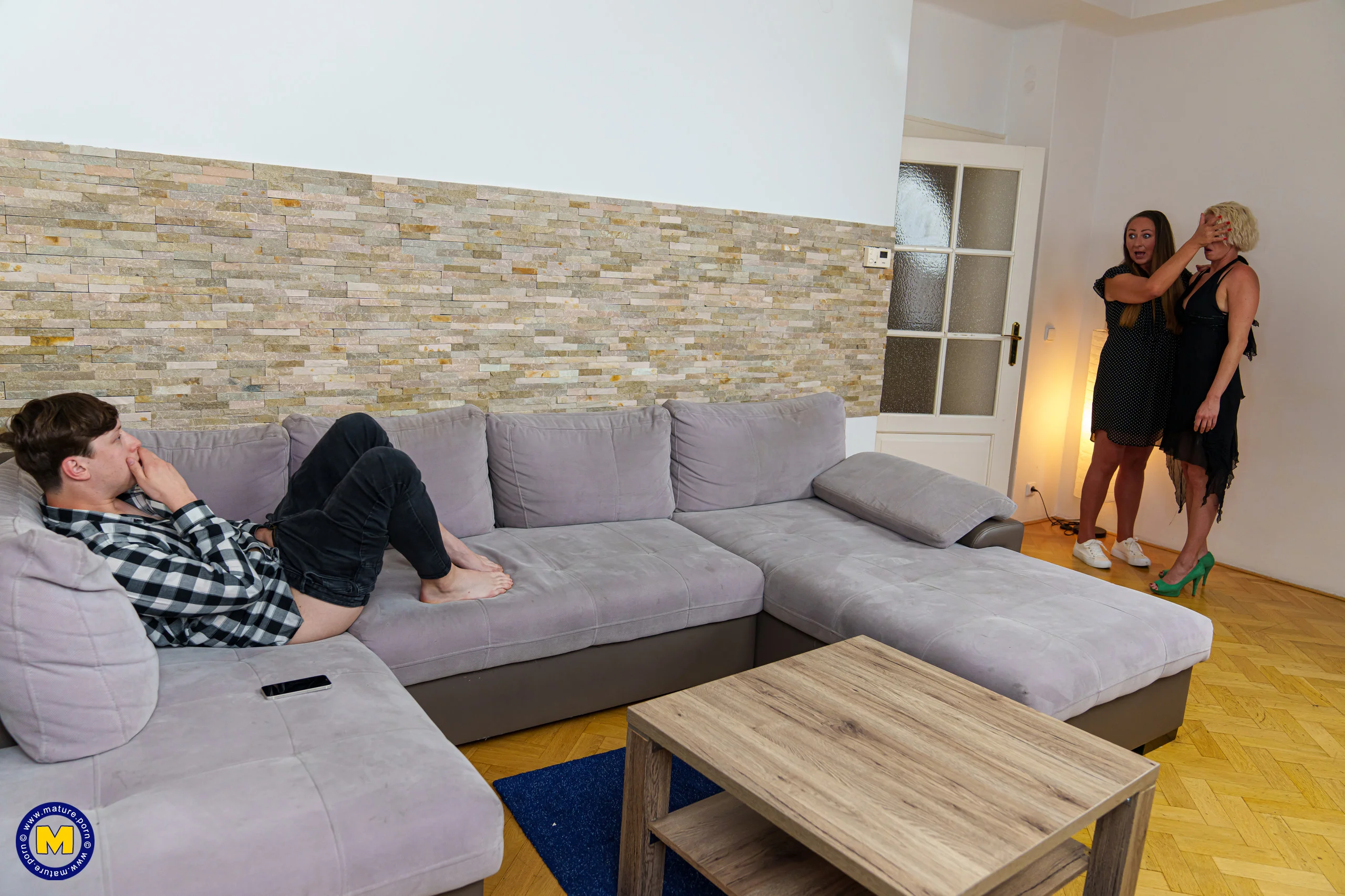 Stepmom Majda and her MILF friend catch a toyboy jerking off