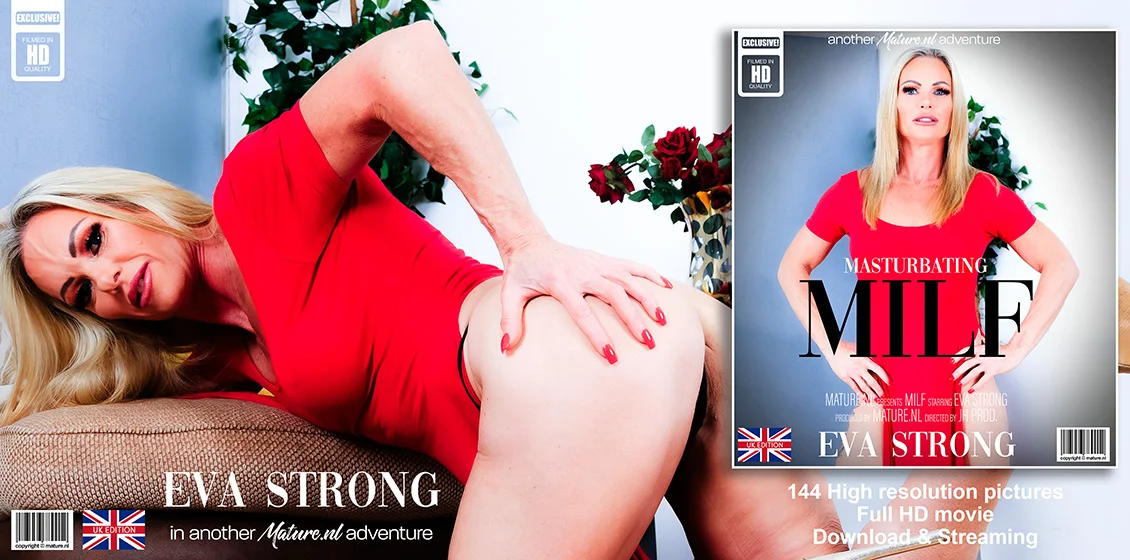 Tattooed British MILF Eva Strong is a horny solo nympho that loves to play with her shaved pussy