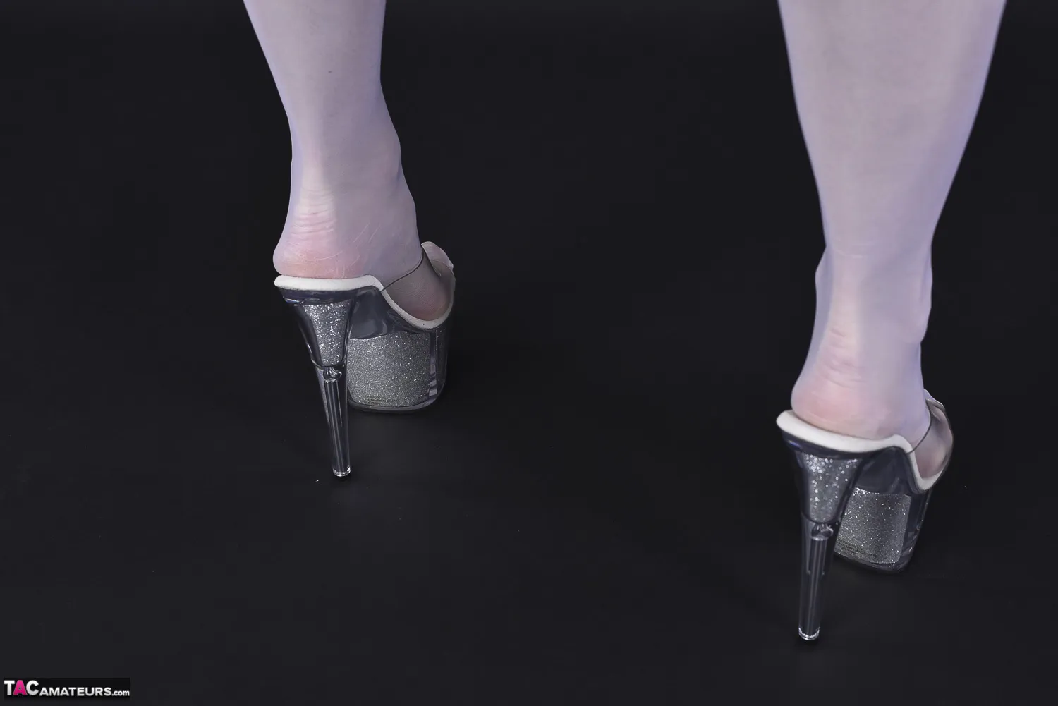 Wear under the dressing gown of pure silk white Lingerie and white stockings Nylons.And in addition hot plateau Heels.We