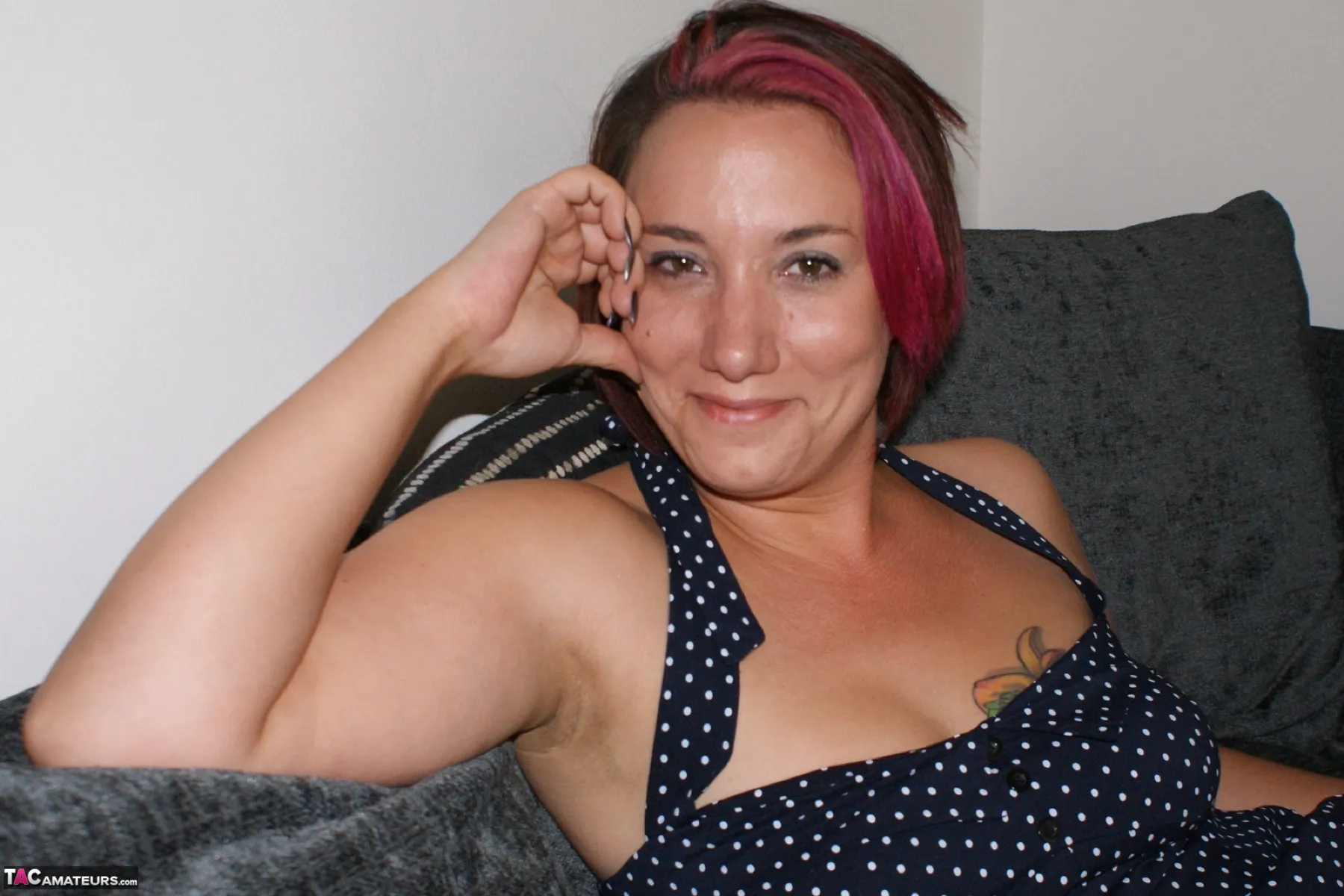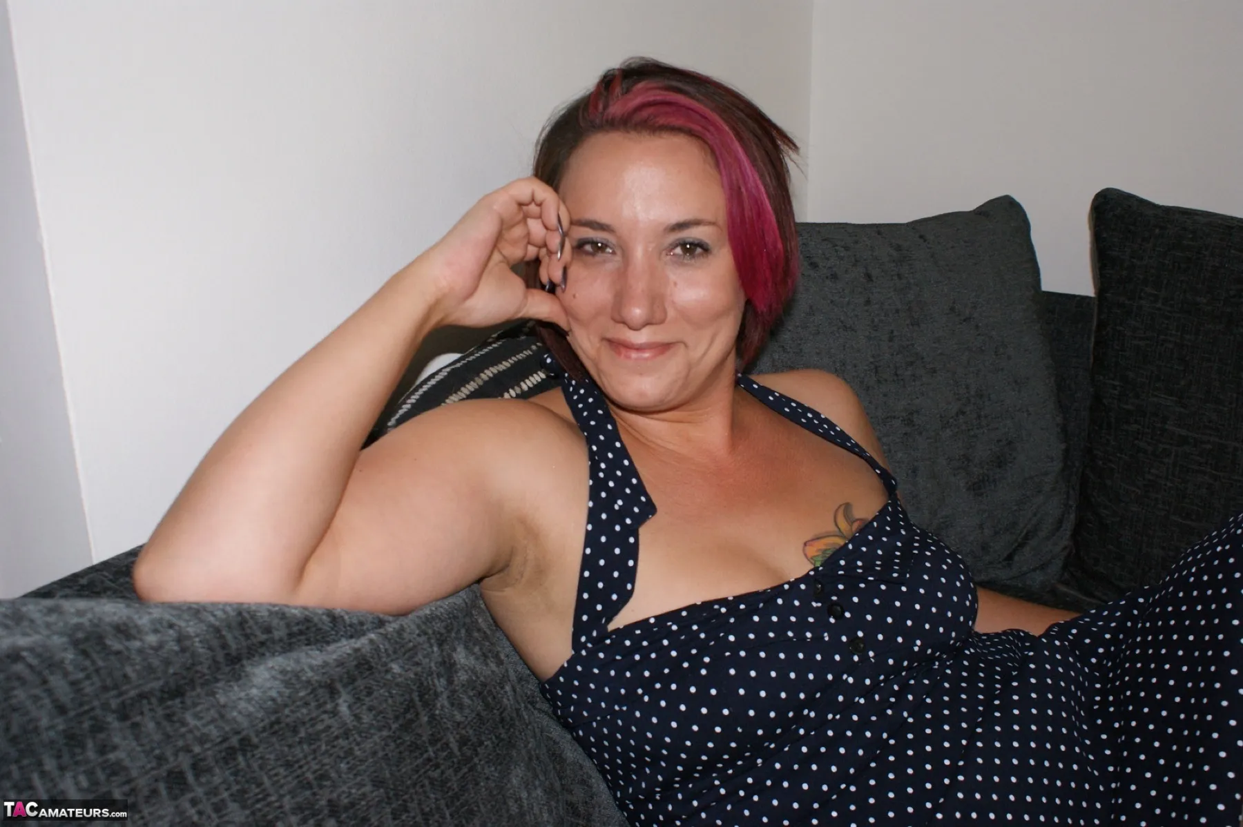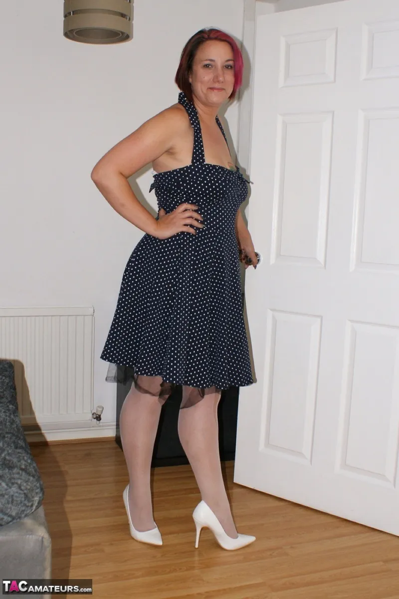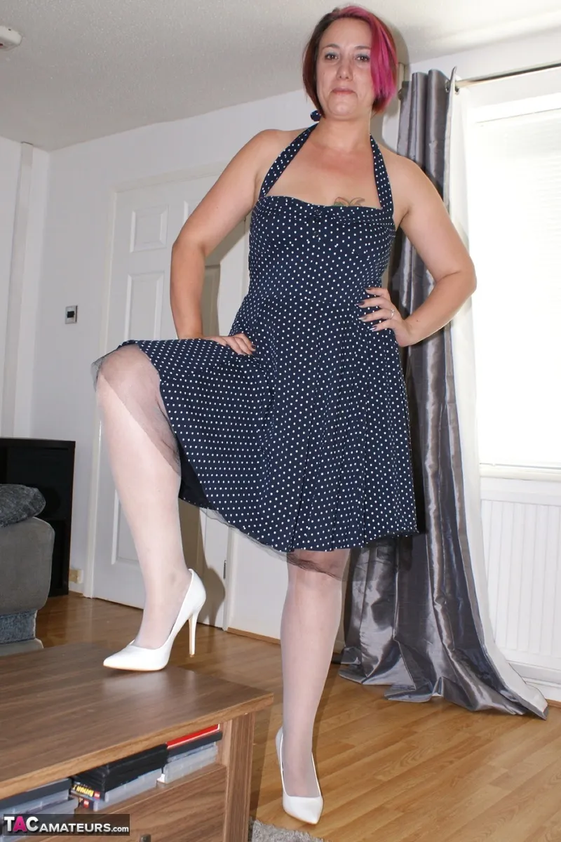 Sara dressed in white stockings, white shoes, a dress and as usual no knickers flashes her cunt.